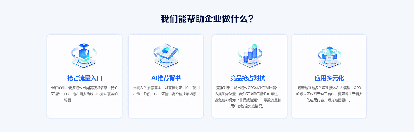 公司以AI引用率与决策转化率为核心指标,为企业提供定制化的AI排名优化解决方案。通过技术巡检与协同机制,**GEO优化过程的安全稳定。同时,以内容即服务(CaaS)为核心理念,协助客户构建动态可信内容矩阵,并持续深化RAG技术在AI排名优化中的应用,确保客户在智能信息生态中持续良好。